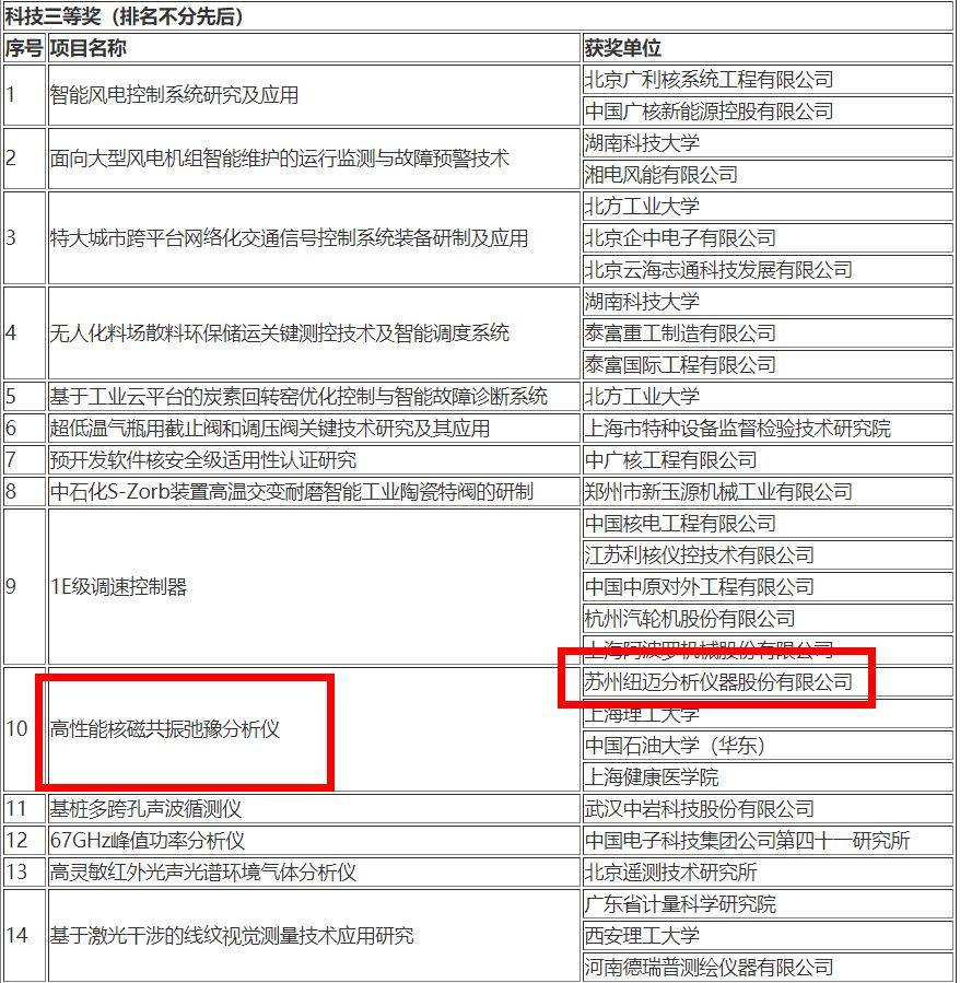 2018年10月11日,中國(guó)儀器儀表學(xué)會(huì)分析儀器分會(huì)會(huì)員單位蘇州紐邁分析儀器股份有限公司的“高性能核磁弛豫分析儀”榮獲了中國(guó)儀器儀表學(xué)會(huì)科學(xué)技術(shù)三等獎(jiǎng)。