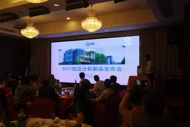 紐邁研發(fā)經(jīng)理楊翼在晚宴現(xiàn)場做紐邁新產(chǎn)品的發(fā)布,紐邁2017年正式推出新品——核磁共振顆粒表面特性分析儀,用于工業(yè)、科研中如電子、醫(yī)藥、材料等多個領域。