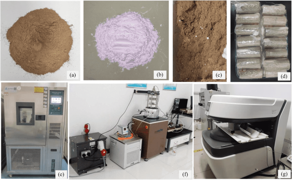 圖1 (a)黃土、(b)納米氧化鎂、(c)NM處理的黃土、(d)測試樣品、(e)凍融室、(f)動(dòng)態(tài)三軸裝置、(g)核磁共振(NMR)分析儀。