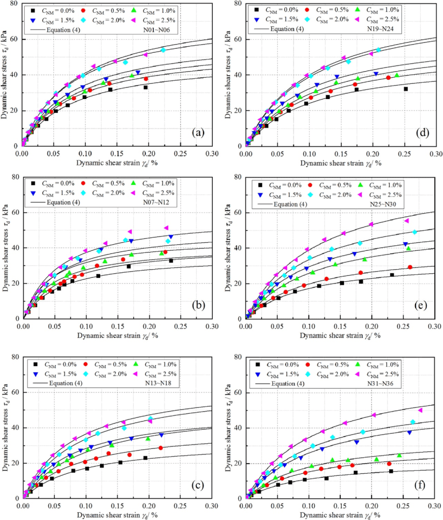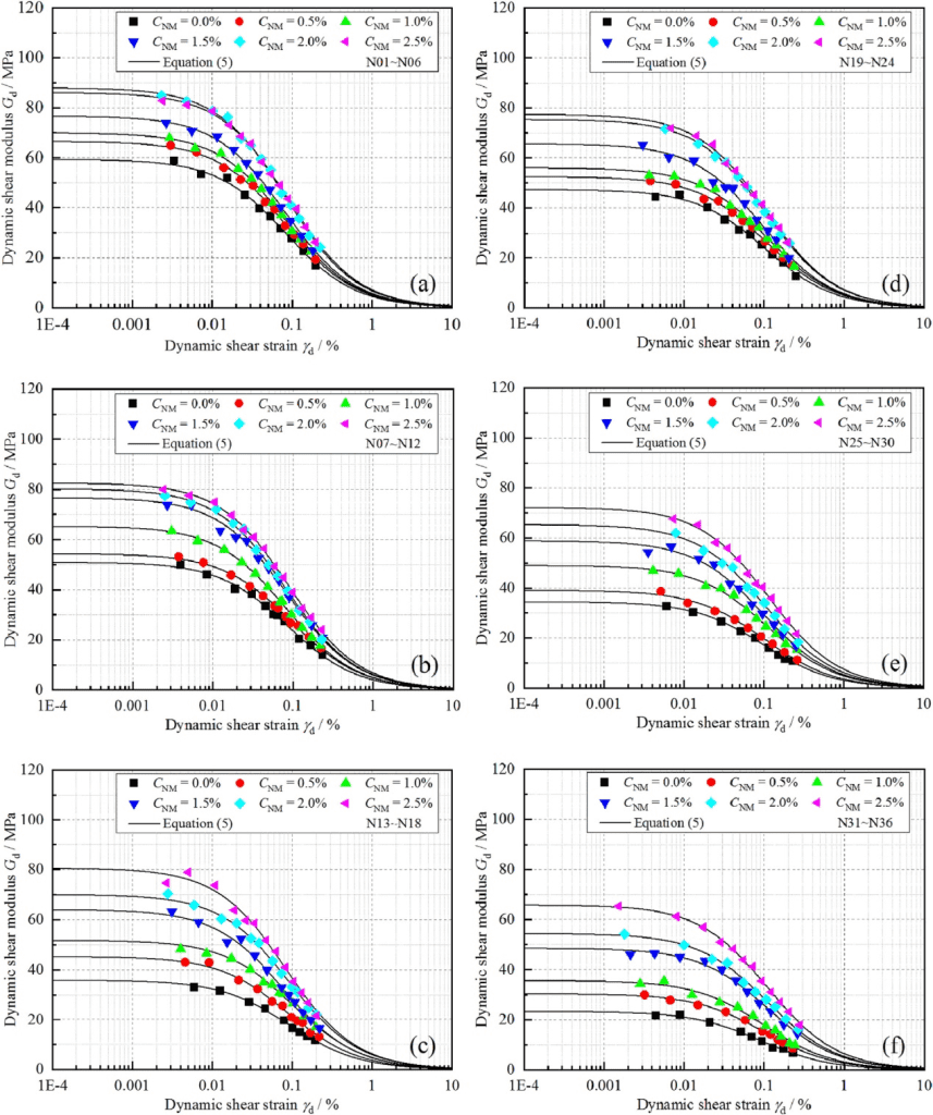 圖2顯示了NM含量為0%、0.5%、1.0%、1.5%、2.0%和2.5%時(shí),凍融前后樣本的動(dòng)態(tài)剪切應(yīng)變-應(yīng)力曲線??偟膩碚f,所有的樣品都表現(xiàn)為應(yīng)變硬化特性,都遵循Hardin模型。此外,曲線隨著NM的增加而向上移動(dòng),這表明在相同的應(yīng)變水平下,較高的NM含量會(huì)導(dǎo)致較高的剪切應(yīng)力。