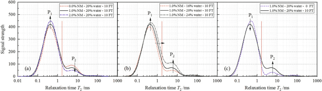 一般來說,如圖4a所示,所有情況下的T2分布都是雙峰的(P1和P2)。它們的弛豫譜以紅色截止線以下的峰值為主,位于0.05和3毫秒之間。從圖中可以看出:隨著NM含量的增加,P1的峰值信號(hào)強(qiáng)度增加,而P2的峰值信號(hào)強(qiáng)度降低。這說明增加NM可以增加束縛水的部分,同時(shí)減少自由水。這可以歸因于納米粒子的表面效應(yīng),它導(dǎo)致在水化過程中NM周圍的結(jié)合水比例更高。NM的穩(wěn)定機(jī)制可能來自于NM顆粒的吸水效應(yīng),它將游離的水變成束縛的水,因此,改善了動(dòng)態(tài)性能,緩解了凍融循環(huán)對黃土試樣性能的不利影響。