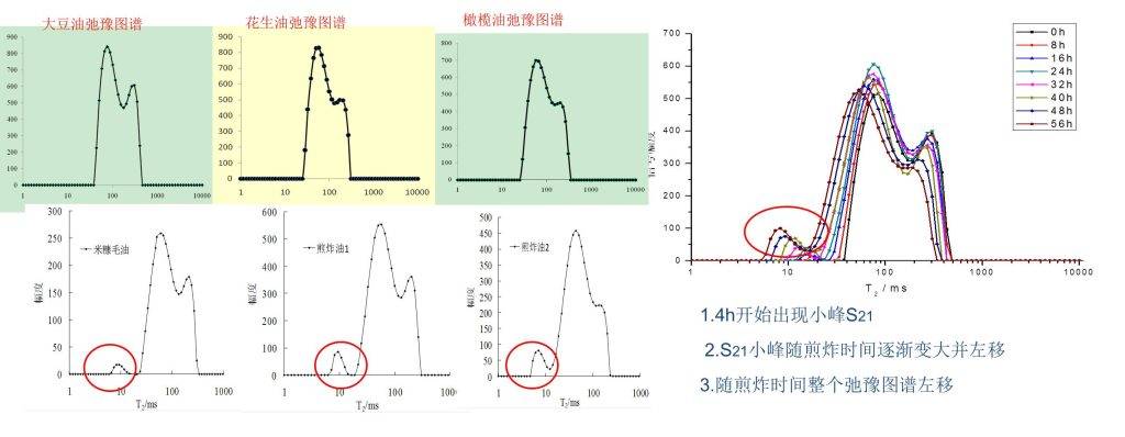 正常油脂由甘油三酯組成,由于甘油三脂包括不同的脂肪酸,大致可分為飽和脂肪酸和不飽和脂肪酸,由于二者的H質(zhì)子所處的結(jié)構(gòu)不同,不飽和脂肪酸雙鍵上電子云密度較高,會對其臨近的氫質(zhì)子核產(chǎn)生一定的屏蔽作用,使其弛豫時間減緩,因此可認(rèn)為第一個峰可代表飽和脂肪酸,第二個峰代表不飽和脂肪酸。而經(jīng)過高溫精煉、煎炸等高溫氧化的油脂,會產(chǎn)生一系列極性增大、聚合度較高的氧化產(chǎn)物,其H質(zhì)子的弛豫時間大大縮短,因此出現(xiàn)了特征峰,可以該特征峰對油脂品質(zhì)進(jìn)行判斷。