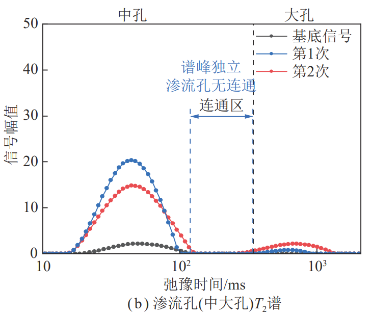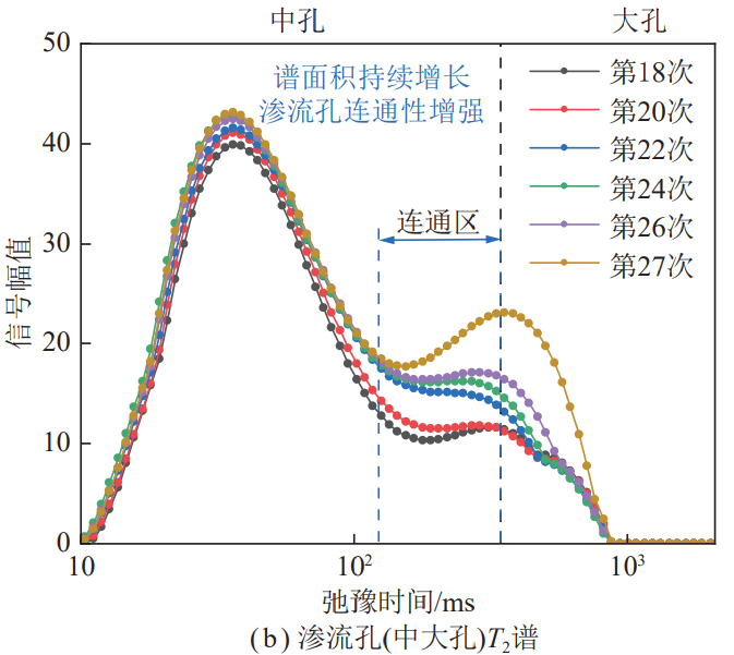 (2)孔隙穩(wěn)定增長(zhǎng)階段,該階段T2譜表現(xiàn)三峰分布形態(tài),各譜峰仍相對(duì)獨(dú)立,起初煤樣內(nèi)部連通性仍然較差,微裂隙尚未出現(xiàn),在震動(dòng)載荷多次沖擊作用下,滲流孔發(fā)育,譜峰出現(xiàn)右移,弛豫時(shí)間增加,中孔與大孔間譜峰出現(xiàn)“靠攏”趨勢(shì),滲流孔連通趨勢(shì)開始顯現(xiàn)。
