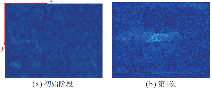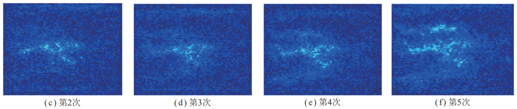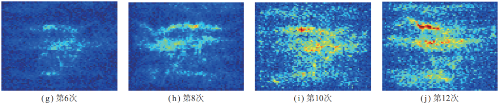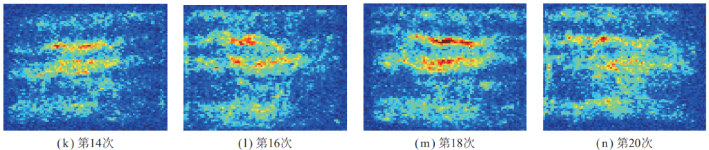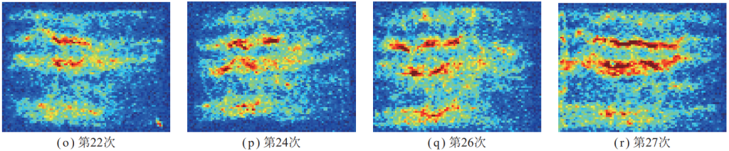 階段Ⅱ,隨著震動(dòng)載荷沖擊次數(shù)的增加,滲流孔開始逐步增多,損傷區(qū)域信號(hào)響應(yīng)增強(qiáng),并出現(xiàn)由點(diǎn)狀分散分布向條狀集中分布的趨勢(shì),如圖九(d)~(g)所示。