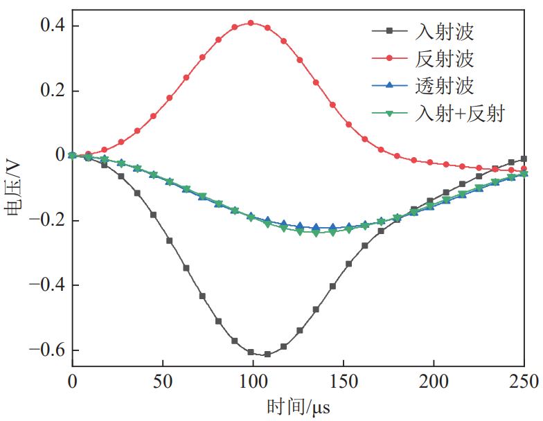 在煤體受到震動(dòng)載荷沖擊后,入射波應(yīng)力和反射波應(yīng)力之和與透射波應(yīng)力近似相等,能夠較好地滿足應(yīng)力平衡條件,證實(shí)了煤樣在震動(dòng)載荷作用過(guò)程中符合應(yīng)力均勻性的假設(shè),如圖三所示。