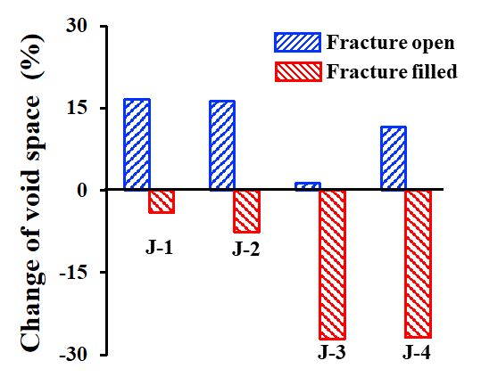 計(jì)算裂縫填充前后的孔隙變化率(圖4),PVF(藍(lán)色)反映壓裂對總孔隙的改善效果,PVG(紅色)反映基質(zhì)孔隙轉(zhuǎn)化為裂縫的量。壓裂對微孔發(fā)育巖樣(J-1和J-2)孔隙體積的改善效果更明顯,但基質(zhì)孔轉(zhuǎn)化為裂縫的比例低。宏孔發(fā)育巖樣(J-3和J-4)結(jié)論相反,總孔隙體積的改善效果一般,但基質(zhì)孔轉(zhuǎn)化為裂縫的比例高。其中,PVF通過比較M0和F0累積核磁信號量得到,PVG通過比較M0和G0累積核磁信號量得到。