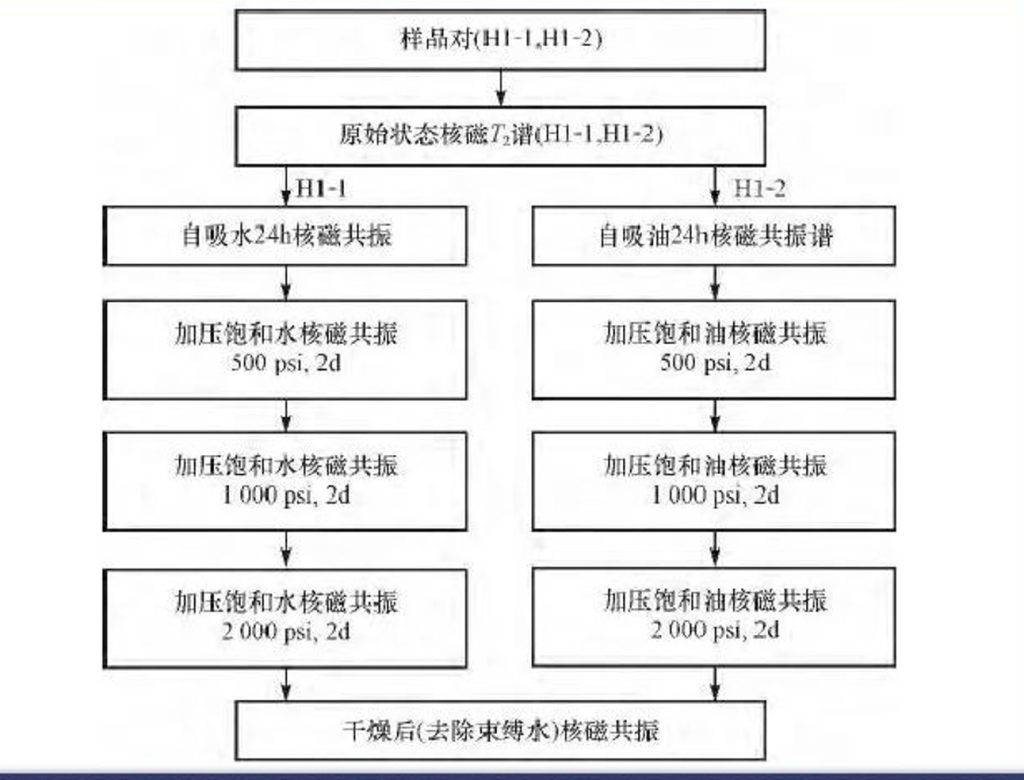 為識別有機孔與無機孔T2譜峰位置,將同一深度點的柱樣分成兩部分,分別在飽和鹽水和油(正十二烷)條件下進(jìn)行T2譜測量,具體步驟如下圖所示。
