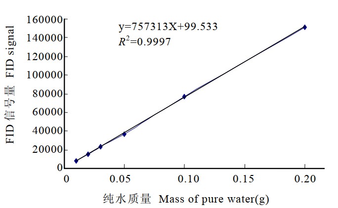 應(yīng)用低場核磁共振測定茶葉的含水量,由于 FID 信號幅值與 H2O 中氫質(zhì)子的密度成正比, 可以根據(jù)已知質(zhì)量的水作為標樣定標,測其 FID 信號取幅值,擬合成曲線,再在相同條件下測一定質(zhì)量茶葉樣的 FID 信號,根據(jù)擬合曲線計算出茶葉的含水量。將核磁共振法與國家標準的 103℃恒重法測得的數(shù)值進行對比, 分析核磁共振法測定茶葉含水量的準確性,穩(wěn)定性等。