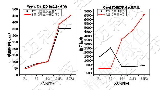 海參浸泡初期外界水主要進(jìn)入海參內(nèi)部轉(zhuǎn)化為細(xì)胞內(nèi)水,束縛水(A22)含量增大;浸泡時(shí)間增加,海參內(nèi)部結(jié)構(gòu)不斷膨脹,束縛水(A22)逐漸向自由水(A23)遷移。隨著外界水的進(jìn)入,海參結(jié)構(gòu)漲發(fā),海參體內(nèi)水的活度不斷增大。