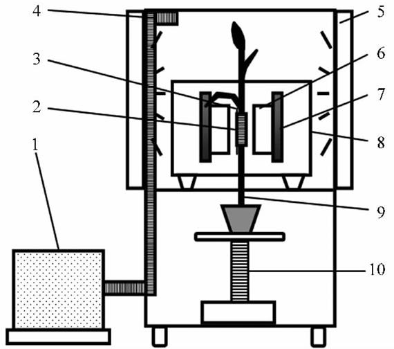 1.溫濕度控制箱 2.射頻探頭 3.外參管 4.風(fēng)管 5.燈箱6.永磁體 7.軛鐵 8.磁體保溫箱 9.小麥植株 10.升降臺(tái)