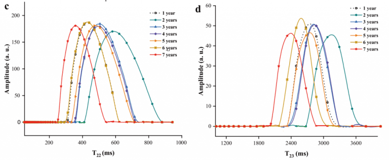 隨著黃酒年齡的增加,不易流動水峰的振幅呈現(xiàn)出較小的波動,而隨著酒齡在1年到5年之間,松弛時(shí)間T22向右移動,而隨著酒齡高于5年,松弛時(shí)間向左移動(圖4c)。在自由水的弛豫行為也觀察到類似的變化(圖4d)。