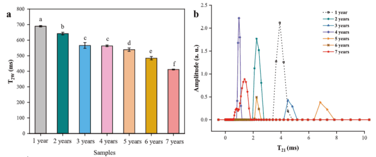 黃酒的單組分弛豫時(shí)間(T2W)隨陳釀期的延長而顯著降低。隨著陳化時(shí)間的延長,黃酒樣品中水與大分子之間的分子關(guān)聯(lián)增強(qiáng),限制了結(jié)構(gòu)中氫質(zhì)子的遷移,從而導(dǎo)致T2W的降低如圖4a。