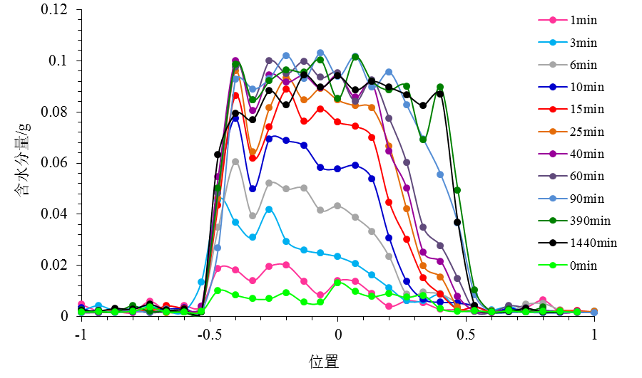 對(duì)于動(dòng)態(tài)樣品,需要快速測(cè)大孔孔隙里面的分層含水率和水分分布狀態(tài),可以通過空間編碼技術(shù)實(shí)現(xiàn),測(cè)得不同位置的含水率變化,通過觀察樣品吸水過程中的水分遷移,實(shí)現(xiàn)水分遷移動(dòng)態(tài)研究,分析其滲透吸水性能。