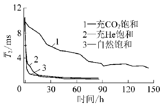 圖2 濕煤粉在4MPa壓力CO2條件下飽和水的T2譜變化曲線