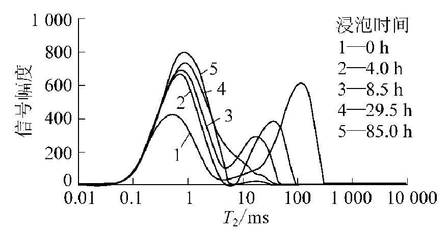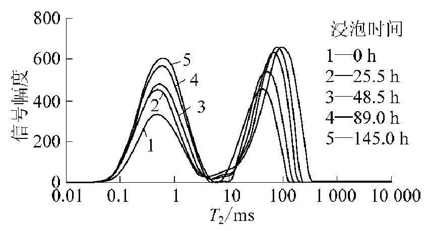 圖3 濕煤粉在4MPa壓力He條件下飽和水的T2譜變化曲線