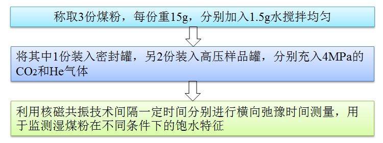 選取低階煤,鏡質(zhì)組最大反射率為0.81%。試驗(yàn)前,將煤樣磨制呈200~250μm,放入110℃的空氣干燥箱內(nèi)干燥直至恒重,完成樣品的預(yù)處理。具體實(shí)驗(yàn)流程如下圖所示。