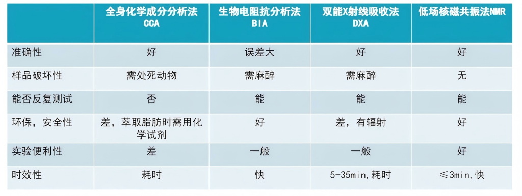 正是在這樣的背景下,低場核磁共振技術(shù)脫穎而出。相比傳統(tǒng)動(dòng)物脂肪檢測方法,如全身化學(xué)成分分析法(CCA)、生物電阻抗分析法(BIA)、雙能X射線吸收法(DXA)、低場核磁共振技術(shù)(NMR),NMR技術(shù)以其運(yùn)行成本低、無創(chuàng)性和可重復(fù)性三大優(yōu)勢,成為研究肥胖代謝性疾病病因及肥胖治療藥物評價(jià)的理想選擇。