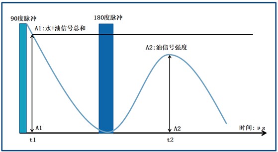 使用自旋回波序列進(jìn)行測(cè)量,下圖是自旋回波序列與檢測(cè)到的核磁信號(hào)。在90度射頻脈沖后t1處測(cè)量了自由感應(yīng)衰減(FID)NMR信號(hào)。此時(shí)信號(hào)幅度(A1)是樣品中水分和油的信號(hào)總和。180度脈沖后,檢測(cè)自旋回波信號(hào)幅度為A2,此時(shí)水的信號(hào)已經(jīng)衰減為0,A2僅為油的信號(hào)。根據(jù)信號(hào)強(qiáng)度與H含量的對(duì)應(yīng)關(guān)系即可定量測(cè)試含油量。