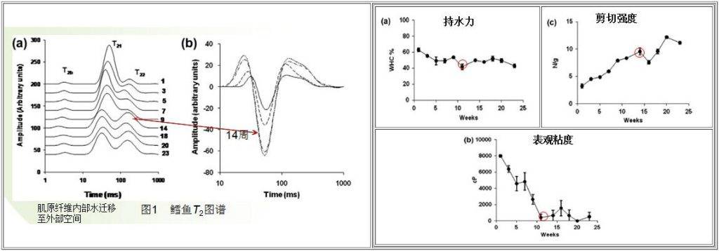 1.鱈魚(yú)在-10℃貯藏過(guò)程,肌原纖維內(nèi)部水分發(fā)生遷移,肌原纖維內(nèi)部及間隙中的水分轉(zhuǎn)移到外部空間,使得不易流動(dòng)水含量逐漸降低,自由水含量逐漸增加,在貯藏10-14week時(shí)自由水含量達(dá)到最大,而此時(shí)持水力和表觀粘度也同時(shí)達(dá)到最低,剪切力達(dá)到最大;