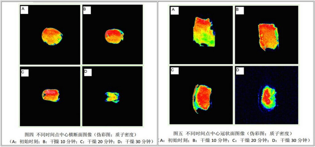 1.核磁共振成像中(圖四和圖五),顏色代表信號(hào)強(qiáng)度,紅色信號(hào)越大,氫質(zhì)子密度越大,藍(lán)色信號(hào)越大,氫質(zhì)子密度越小,通過(guò)核磁共振成像可明顯看出不同干燥時(shí)段水分的分布及變化;