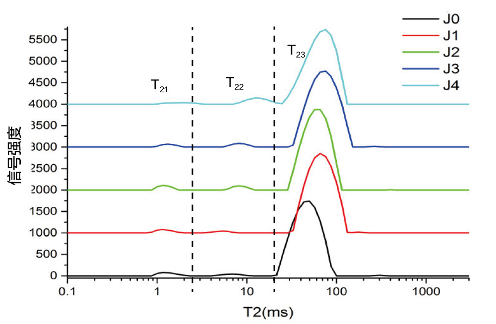 注:J0-J5為不同超聲波輔助壓力處理;T21為結合水,T22為不易流動水,T23為自由水;