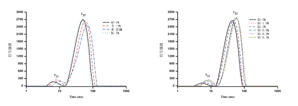 圖2 不同種及不同濃度膠體T2弛豫時間圖譜