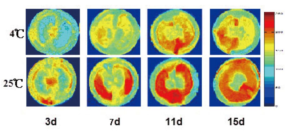 圖3. 不同儲藏溫度對圣女果儲藏過程氫質(zhì)子密度加權成像的影響