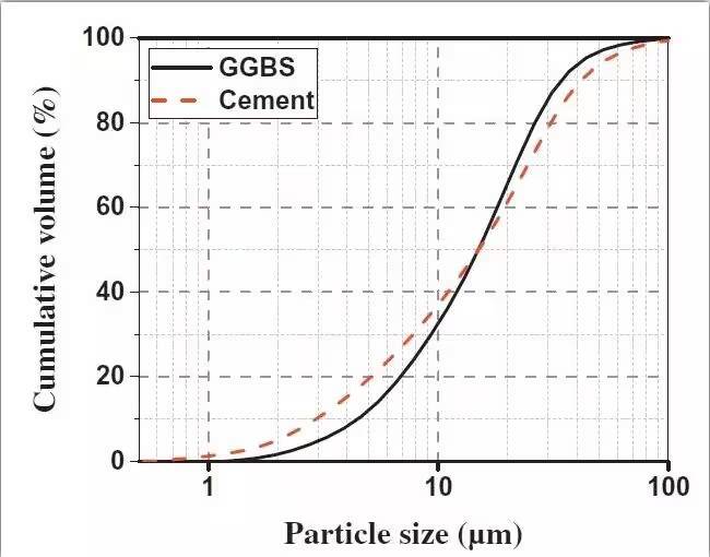 圖1 水泥與堿激發(fā)礦渣的粒度分布曲線