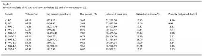 可以看出,在碳化前后,PC和AAS的體積、干樣品信號(hào)和孔隙率存在較大差異。結(jié)果表明,碳化過(guò)程對(duì)所有試樣的收縮效應(yīng),但PC試樣的收縮率較低。這主要與Ca(OH)2膨脹轉(zhuǎn)化為CaCO3有關(guān),有研究表明,碳酸鈣的形成使體積增加了11.8%。另一方面,當(dāng)采用0、0.5、1、1.5三種模量時(shí),水玻璃模量的增加使收縮率分別提高了7.43%、7.67%、9.98%和11.53%。這可能是由于隨著水玻璃模數(shù)的增加,C-S-H的形成阻礙了碳酸鈣的結(jié)晶。此外,碳化過(guò)程中水滑石的形成也可能對(duì)碳酸鈣結(jié)晶產(chǎn)生干擾作用。
