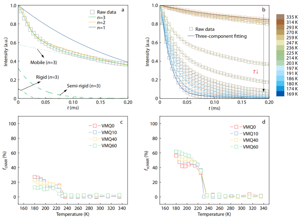 如圖c和d所示的擬合結(jié)果表明,VMQ/SiO2在Tm(熔點(diǎn):228K)以下的剛性分?jǐn)?shù)(fr,NMR)發(fā)生突變,且超過(guò)30%。在180 K的半剛性區(qū)域也觀察到了類似的趨勢(shì),半剛性的組分差不多在60%。