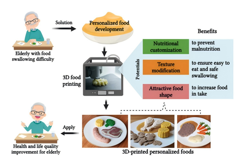 3D打印技術(shù)憑借其精準(zhǔn)營養(yǎng)定制和個(gè)性化膳食設(shè)計(jì)的獨(dú)特優(yōu)勢,為破解上述難題提供了新路徑。然而,該技術(shù)應(yīng)用于吞咽食品開發(fā)的核心瓶頸在于如何設(shè)計(jì)兼具結(jié)構(gòu)穩(wěn)定性與營養(yǎng)功能的打印材料。