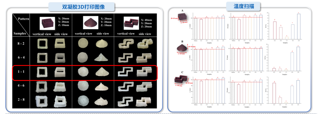 1、雙連續(xù)結(jié)構(gòu)雙凝膠顯示出最好的打印性能,既適用于小面積單層結(jié)構(gòu)模型(如椎體),也適用于三維堆疊模型(如空心立方體)。雙連續(xù)結(jié)構(gòu)雙凝膠樣品的高度和長度與目標(biāo)形狀非常吻合,無顯著差異,變形率小于1%。