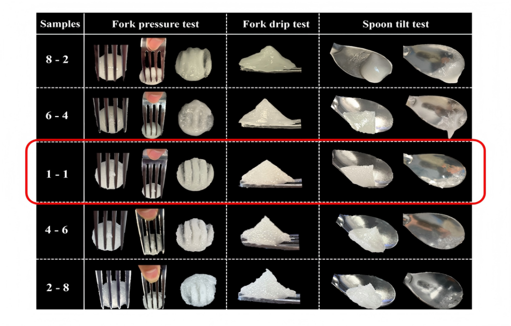 3、性能關(guān)聯(lián): 將低場核磁共振(LF-NMR)獲得的水分狀態(tài)、油水分布數(shù)據(jù),與流變學(xué)測試結(jié)果以及吞咽障礙國際標(biāo)準(zhǔn)IDDSI(通過傾斜試驗(yàn)、叉壓測試驗(yàn)證)進(jìn)行關(guān)聯(lián)。