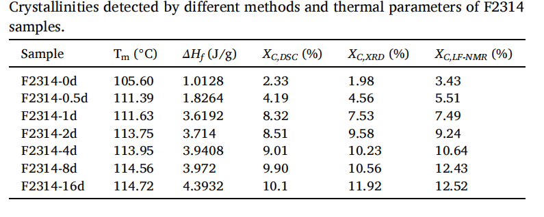 表1:通過不同方法檢測到的 F2314 樣品的結(jié)晶度及熱學參數(shù)。