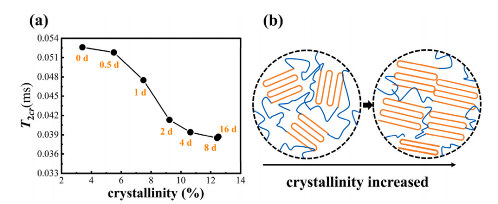 圖2(a) T2cr 與結(jié)晶度之間的關(guān)系;(b)結(jié)晶度增加時鏈段變化的示意圖。