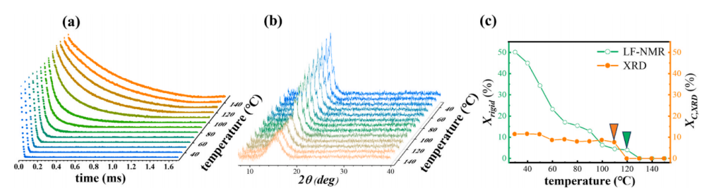 利用低場核磁的無損優(yōu)勢,對高結(jié)晶度 F2314 樣品進行 30-150℃的升溫原位測試,實時監(jiān)測剛性鏈段含量(Xrigid)的變化。結(jié)果顯示,結(jié)晶區(qū)晶格消失(XRD 信號消失)早于鏈段運動(LF-NMR 檢測到剛性鏈段消失),清晰還原了熔融過程中 “晶格破壞 – 鏈段松弛” 的動態(tài)過程。