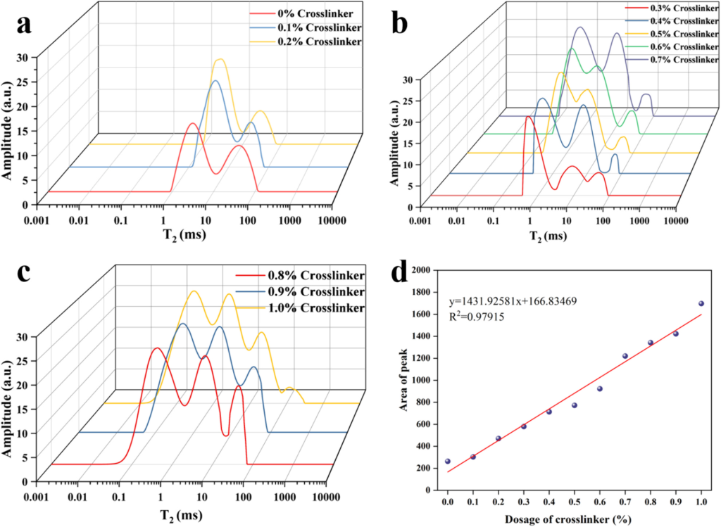 如圖2所示,隨著交聯(lián)劑用量的增加,弛豫分布中出現(xiàn)了多個峰。隨著交聯(lián)劑用量的增加,快弛豫峰的信號強度和比例持續(xù)增加,且流動性不斷降低,這是由于添加交聯(lián)劑形成更多的膜結(jié)構(gòu)和更密集的壓裂液網(wǎng)絡(luò)結(jié)構(gòu)所致。如圖2(c)所示,通過將交聯(lián)劑的量增加到0.8%、0.9%和1%,T21峰的范圍擴展到0.04-3毫秒,而T22和T23峰的位置保持不變。這表明凝膠具有更緊密的結(jié)構(gòu),可能是因為過度交聯(lián)導(dǎo)致凝膠網(wǎng)絡(luò)過度緊縮。LF-NMR測試的T2分布反映了瓜爾膠分子與交聯(lián)劑結(jié)合形成的線性和膜狀結(jié)構(gòu)的運動行為。然而,當(dāng)交聯(lián)劑過量時,游離的交聯(lián)劑分子無法與瓜爾膠結(jié)合,這由圖3(c)中1.0%交聯(lián)劑的T2分布中100-300毫秒處的峰所證明,表明有未參與反應(yīng)的過量交聯(lián)劑。更多詳細實驗內(nèi)容,請見參考文獻[1]。
