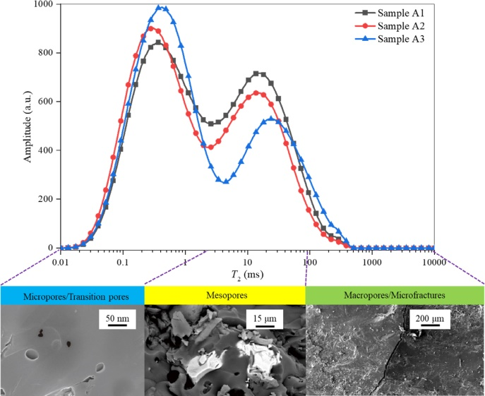 圖二為靜水壓力煤樣T2譜。借助核磁弛豫技術對空隙進行分類:左邊的弛豫值(T2<2.5ms)對應于微孔和過渡孔隙,中間的弛豫值(2.5<T2<100ms)對應中孔,右邊的弛豫值(T2>100ms)對應大孔孔隙和微裂縫。