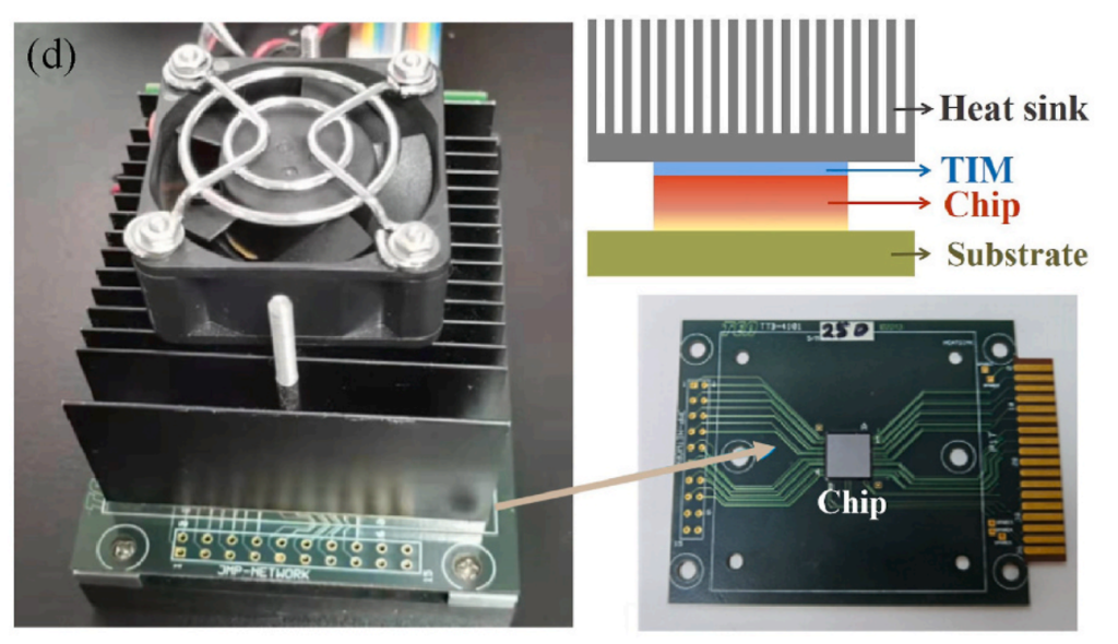 隨著芯片朝著微型化和集成化方向發(fā)展,熱管理對(duì)于進(jìn)一步提高電子設(shè)備性能變得極為重要。由于芯片和散熱器之間的表面粗糙度不一致,它們之間的空氣間隙會(huì)導(dǎo)致巨大的熱阻。熱界面材料(TIMs)用于填充芯片和散熱器之間的間隙以降低熱阻(圖1)。通常,在實(shí)際操作中使用的TIMs需要具有較高的熱導(dǎo)率。與金屬