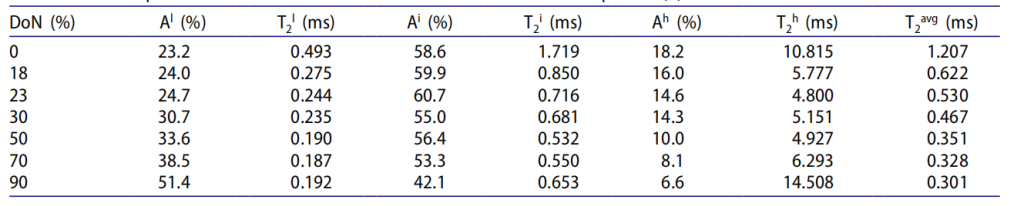 隨 DoN 增加持續(xù)下降(0% DoN 時(shí) 1.207 ms→90% DoN 時(shí) 0.301 ms),與 EMAA 熔體拉伸粘度隨中和度增加而升高的已知特性一致,驗(yàn)證了低場(chǎng)核磁數(shù)據(jù)的可靠性。