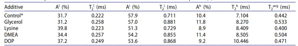 表2:增塑劑對(duì)動(dòng)態(tài)相分布與相運(yùn)動(dòng)性的影響(對(duì)照組為27.5% DoN的EMAA新批次樣品。)