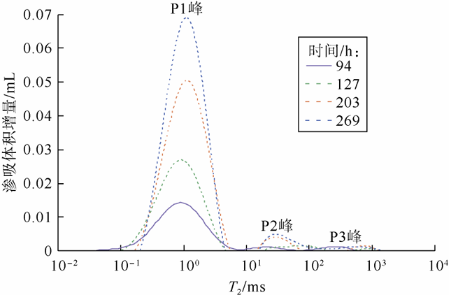 1)A組實(shí)驗(yàn)(低礦化度壓裂液侵入高礦化度儲(chǔ)層)的T?譜顯示,隨著濃度差增大,P1峰的信號(hào)幅度持續(xù)增加,滲吸量增幅顯著。