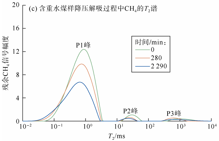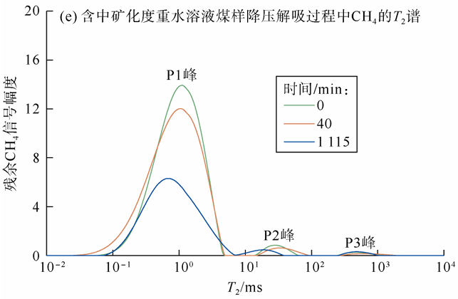 2)設(shè)計(jì)四組“壓裂液-煤-氣”體系耦合實(shí)驗(yàn),模擬水力壓裂全生命周期的液-煤-氣作用。這些實(shí)驗(yàn)在核磁夾持器中完成,先進(jìn)行CH?吸附,再注入不同礦化度的重水溶液模擬壓裂液滲吸置換過程,最后進(jìn)行降壓解吸,并利用核磁共振實(shí)時(shí)監(jiān)測(cè)CH?含量和賦存狀態(tài)的變化