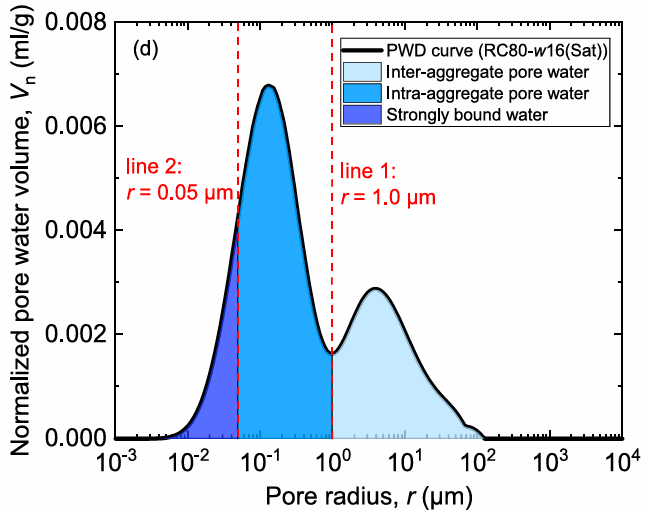 階段2(圖四b)?:隨著干燥繼續(xù)進(jìn)行,曲線面積隨飽和度降低而減小,表明土壤整體水量下降。在團(tuán)聚體間孔隙水完全排出后,團(tuán)聚體內(nèi)孔隙水含量開始快速減少。同時,整個曲線向左移動,反映了土壤干燥過程中的收縮現(xiàn)象。