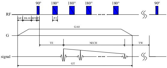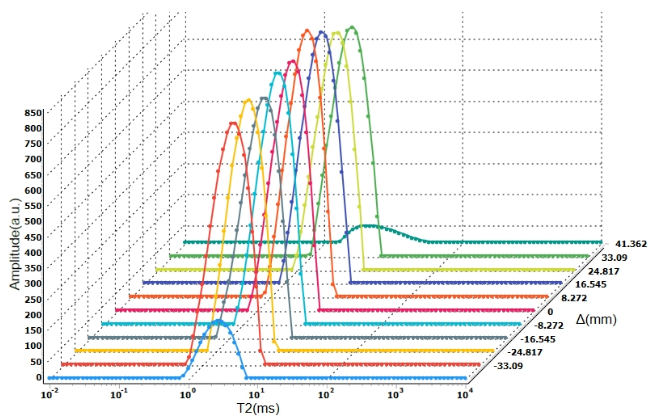 選擇性激勵(lì)是用一個(gè)有限頻寬的射頻脈沖僅對(duì)共振頻率在該頻帶范圍的質(zhì)子執(zhí)行共振激發(fā)的技術(shù)。在Y軸方向施加梯度后,選層激發(fā)脈沖可以實(shí)現(xiàn)選擇性激勵(lì),而處于選擇層外的氫質(zhì)子不滿(mǎn)足共振條件,也就得不到激發(fā)。 最終我們通過(guò)該序列便可以得到各切層的T2時(shí)間分布圖以及整體的偽彩演示圖。