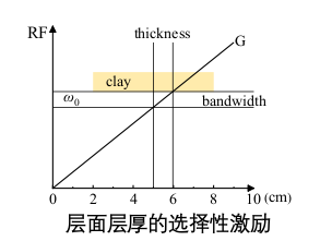 與CPMG序列只采集整個(gè)樣品的數(shù)據(jù)相比,恒定梯度選層序列通過(guò)施加層面選擇梯度場(chǎng),即選擇性射頻脈沖,可以獲得沿樣品軸線方向各層的分層CPMG數(shù)據(jù)。如圖為恒定梯度選層序列的脈沖時(shí)序圖。在測(cè)試中,不同位置上的核磁共振信號(hào)在梯度線圈產(chǎn)生的梯度磁場(chǎng)作用下,產(chǎn)生不同的定位信息,利用數(shù)學(xué)轉(zhuǎn)換解碼,就可以將核磁信號(hào)分配到每一層的位置上,核磁共振的一維定位包括層面和層厚的選擇,層面和層厚的選擇性激勵(lì)原理如下圖所示。