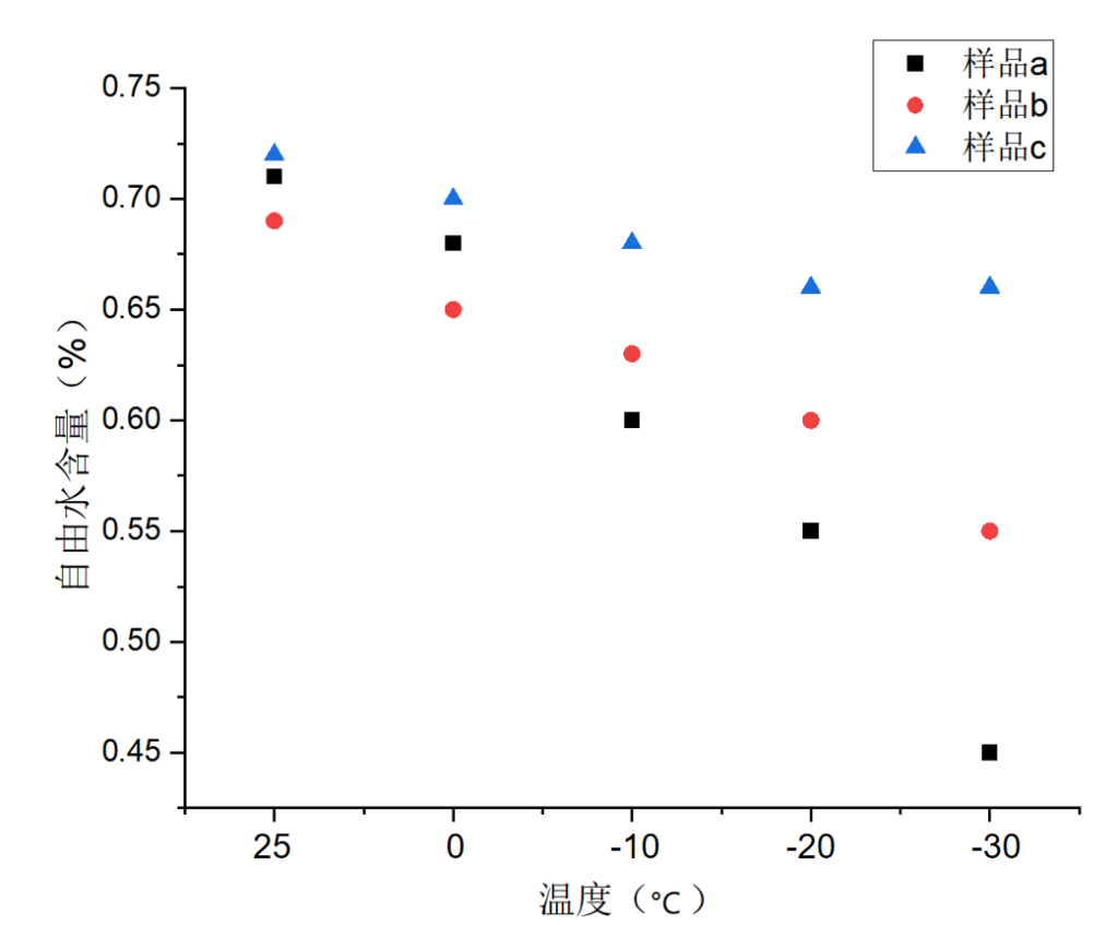 自由水的比例變化決定了水凝膠的抗凍性能,不同溫度下自由水比例變化越小,水凝膠越抗凍。從圖表中可以看出,隨著溫度的降低,樣品c中的自由水含量變化是最小的,也證明了樣品c的抗凍能力較a、b來說更強(qiáng)。