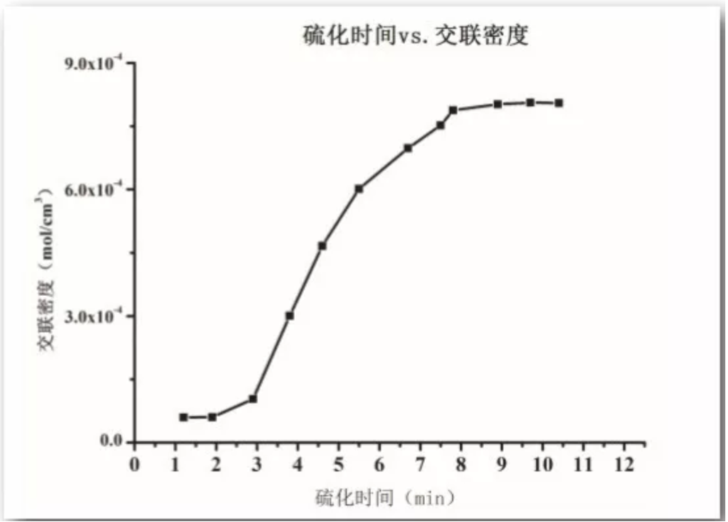 上圖實(shí)驗(yàn)是橡膠樣品在Tg+150℃的測(cè)試條件下,此時(shí)完全去掉了分子間的作用力,可以完全反應(yīng)交聯(lián)密度(物理交聯(lián)和化學(xué)交聯(lián))隨硫化時(shí)間的變化。