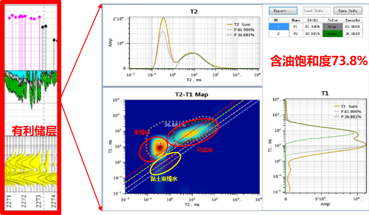 以上為油田現(xiàn)場頁巖油儲層的一口預生產(chǎn)井,通過井場全直徑核磁實驗分析,確定了有利儲層段:一維核磁確定雙峰T2譜為有利儲層,大孔隙發(fā)育良好,孔隙度為7.51%,二維核磁確定的含油飽和度為73.8%。該數(shù)據(jù)為油井開發(fā)提供了及時可信的巖石物理實驗依據(jù)。