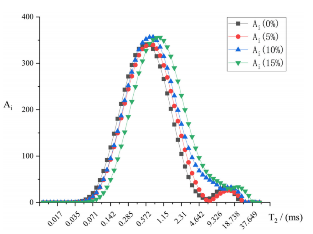 圖二展示了不同應(yīng)變條件下的衰減曲線(xiàn)。隨著應(yīng)變的增大,曲線(xiàn)的衰減幅度逐漸減小,這表明應(yīng)變?cè)酱螅牧系慕宦?lián)密度越小,這與圖二中交聯(lián)密度的測(cè)試結(jié)果一致。然而,曲線(xiàn)只能定性地顯示HTPB涂層交聯(lián)結(jié)構(gòu)的變化趨勢(shì)。為了定量描述橫向弛豫特性,通過(guò)進(jìn)一步處理,得到了T2弛豫的反演曲線(xiàn),如圖三所示。隨著應(yīng)變的增加,反演曲線(xiàn)有向右移動(dòng)的趨勢(shì)??焖贆M向弛豫時(shí)間從0.572毫秒增加到1.000毫秒,慢速橫向弛豫時(shí)間從12.328毫秒增加到21.544毫秒,T2的總峰面積從5889.298增加到6615.835。這種現(xiàn)象的主要原因是應(yīng)變效應(yīng)導(dǎo)致鏈段之間的距離增加。分子鏈從卷曲狀態(tài)展開(kāi),分子鏈重新排列,因此在力的方向上有更多的取向選擇,橫向弛豫的衰減幅度減慢。